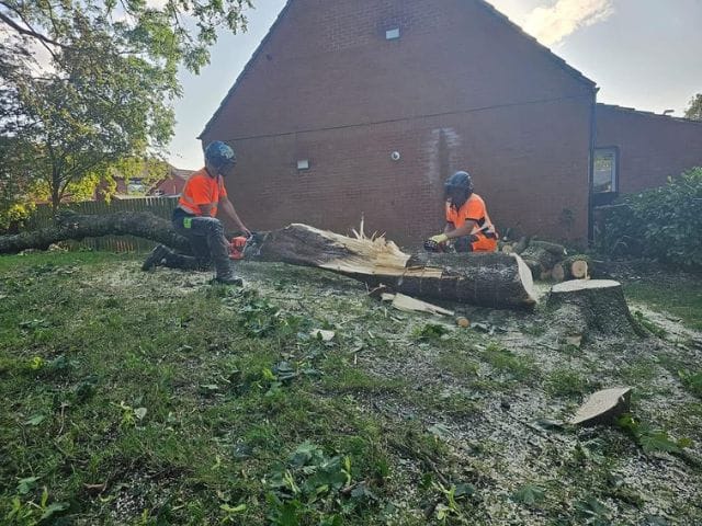Our expert tree surgeons in Bolton tackled Storm Lilian’s aftermath head-on, expertly sectioning and removing this massive fallen tree in a local garden. Using professional chainsaws and safe rigging techniques, the team cleared dangerous debris, cut the trunk into manageable sections, and left the site clean and safe—all completed on the same day. Contact us today for a free, no-obligation quote.