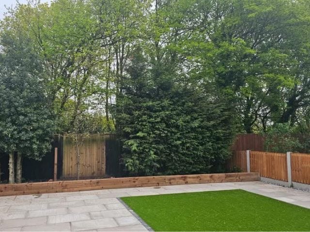 Our tree surgeons in Bolton delivered a complete tree removal and tip back, transforming this overgrown garden into a safe, usable outdoor space. The team expertly felled the obstructing tree, trimmed back the dense hedge to the boundary line, and removed every branch and root—leaving a clean, level site perfect for the new artificial lawn and paving installed by the homeowner.